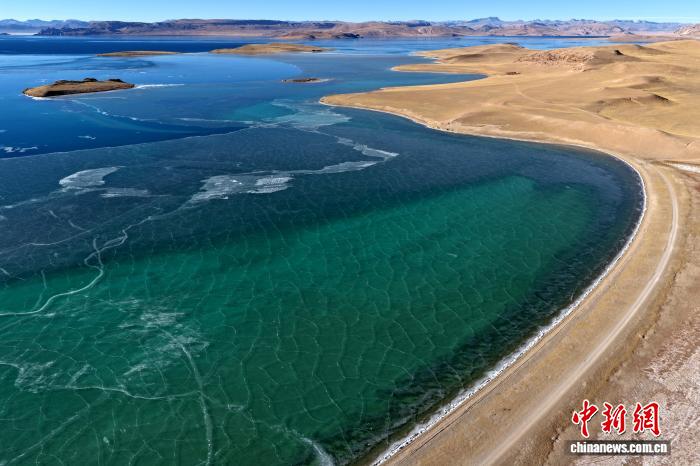 12月20日,航拍错鄂湖。错鄂湖,位于西躲那直市申扎县境内乱,是色林错的卫星湖。冬季错鄂湖正在阳光晖映停,湖停出现蓝、绿等多种脸色,景致诱人。图为错鄂湖景致。(无人机像片)中新社记者 李林 摄